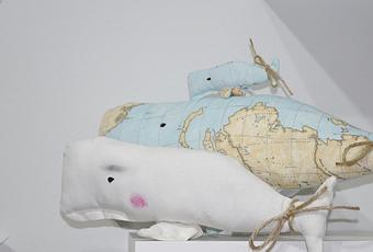 Cachalotes, como su nombre indica, corresponde a estas 3 simpáticas ballenas de diferentes tamaños (XL, L, S) inspiradas en el mar, lo que nos produce relajación a la hora de la habitación de nuestro bebé. El tejido es 100% algodón, compuesta de estampado de mapamundi combinada con tela lisa de color blanco roto. Van pintadas a mano los ojos, rubor y ceja. Y atadas con hilo de yute.