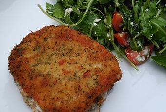 Ingredientes: 4 filetes lomo de cerdo; 20 g champiñones castaña; 20 g ricotta; 2 lonchas jamón serrano; harina; huevo; pan rallado; aceite; sal; pimienta.