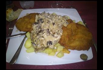 De tamaño como veis está bien, y el rebozado también. Me parecía que tenía poco sabor, es decir “normalin”, le faltaba que estuviera un poco más jugoso y sabor. El queso era lo más flojo y la salsa en el momento que se enfría un poco empieza a crear esa capa “solida” por encima típica de las salsas con nata. No recuerdo quién me dijo una vez, que una carne servida con salsa servía para enmascarar carne mala o de baja calidad (como en los escalopines al cabrales, etc…) es decir, gastar buena carne en un producto que va en salsa y por lo tanto mata el sabor de la carne, el jamón y el queso es un poco ridículo. No quiero decir que en este caso sea así, pero bueno, nunca fui partidario de cachopos con salsa, aunque las setas estaban buenas y al menos un par de variades. El cachopo venia acompañado de una buena ración de patatas.