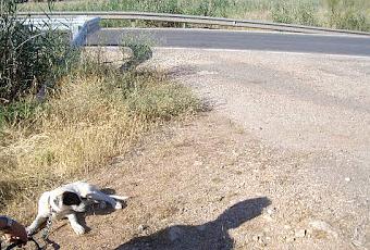 Pero está mañana he pasado de nuevo para mi trabajo y la he visto allí tirada debajo de la señal y ya no la podía dejar allí. He vuelto con un compañero y la hemos llamado con un poquito de pienso y ha venido corriendo, le hemos puesto un collar y la hemos echado al coche.