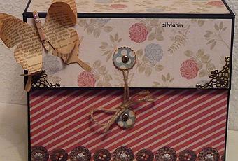 Hace un par de días que terminé este nuevo trabajo.Se trata de un fichero para organizar papeles, recetas de cocina, fotos preparadas para colocar después en un álbum, tarjetas....Es un trabajo mezcla de cartonaje y scrap.Mide 22x18 cm., un buen tamaño para que sea práctico, y en su interior cuenta con seis apartados.Con muy poca decoración, sólamente una mariposa troquelada con papel de un libro antiguo y unas esquineras de filigrana.