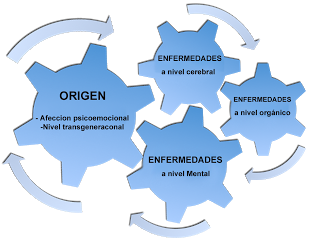 Somos una unidad compuesta de cuatro realidades inseparables: orgánica, cerebral, psíquica y energética. No hay ni una sola célula del cuerpo que escape al control del cerebro, y este no escapa al control del pensamiento, consciente o inconsciente; de manera que ni una célula del cuerpo escapa al psiquismo. Un shock siempre va acompañado de un sentimiento personal que repercute en los cuatro niveles biológicos. ¿Y es irreversible?Cuando encontramos la solución esos cuatro niveles sanan simultáneamente. Una paciente tenía dolor en el hombro. "¿Desde cuándo?", le pregunté. "La primera vez estaba sola con mis hijos" "Si estas con tus hijos, no estás sola, ¿quién falta?" "Mi marido que nunca está, yo necesito estar arropada". Cuando lo reconoció, el dolor desapareció. A lo largo de un día no satisfacemos todas nuestras necesidades fundamentales.Cuando no las satisfacemos, nace una emoción. Si esa emoción se libera en el exterior bajo una forma artística, a través de la palabra, el baile o los sueños... todo va bien. Cuando el acontecimiento no está expresado, queda impreso y el cuerpo será el último teatro de ese evento. ¿Todo conflicto provoca enfermedad?