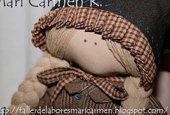 Las botas de cuerotambién están hechas por mí,así como el paraguasLas medias en negro,y aunque no se ve, lleva pololos.Y el vestido con una tela preciosa,en tono azul de fondo y flores marrones.