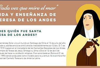 El próximo 6 de julio, inician un nuevo curso online, GRATUITO, dedicado a Teresa de los Andes, con motivo del primer centenario de su muerte. Lo impartirá Fray Wilber Ramírez, ocd. Lleva por título: “Cada vez que mire el mar”. Vida y enseñanza de Teresa de los Andes. Consta de seis sesiones, una cada semana:
