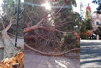 San Luis Potosí.- Este día un inmenso árbol de cerca de 30 metros se desplomó dentro del Jardín del Templo de San Agustín.