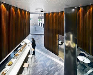 Todos en nuestra ciudad tenemos un café que la representa ( el de toda la vida), pues, en Murcia este café a evolucionado de tal manera que se ha convertido de manos de Clavel Arquitectos en todo un referente de la arquitectura actual. Para empezar, este local no tiene puertas, en el momento que vas paseando por la calle ya estás metido en el diseño del mismo. La madera de iroko es el material que predomina en fachada e interior, dando a la barra del lugar un protagonismo elegante sin olvidar su practicidad. Un lugar que visitar si estáis por la ciudad. Vía: Diseño y arquitectura.net Imágenes: David Frutos
