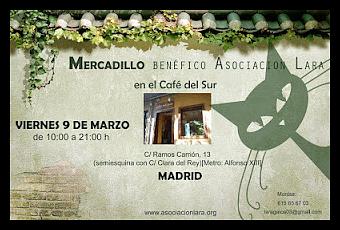 La Asociación Lara en colaboración con el Café del Sur, ha organizado un mercadillo benéfico, con la finalidad de dar a conocer nuestro trabajo, al igual que recaudar dinero para poder continuar recogiendo a aquellos gatos que se encuentran en la calle abandonados y en pésimas condiciones.En el mercadillo podéis encontrar diferentes artículos en venta: artículos artesanales hechos por nuestros voluntarios(jabones, cajas de madera, baúles, cojines, broches, juguetes para los gatos…) al igual que otro tipo de artículos, calendarios, el libro ” Bienvenido a gatos anónimos", bisutería, cajas metálicas, carteras, llaveros…todos ellos a muy buen precio.Además podremos conocernos y disfrutar de un momento de tranquilidad tomando un té o un café, hablando de nuestros intereses y preocupación por los derechos de los animales y en concreto, de los grandes olvidados, los gatos. Os esperamos el viernes 9 de Marzo, desde las 10 hasta las 21:00 horas, puedes encontrarnos en CAFÉ DEL SURC/ Ramos Carrión, 13 (semiesquina con C/ Clara del Rey)Metro: Alfonso XIIIMADRID