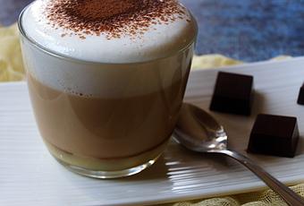 Montamos las tazas, poniendo en la base el chocolate derretido, después el café con cuidado, y la leche por último. Cubrimos con nata montada o espuma de leche y espolvoreamos cacao.