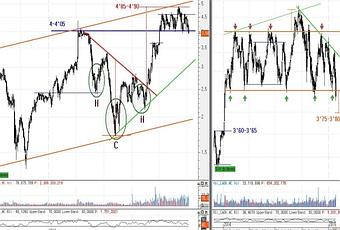 Centrándonos en el más estricto corto y medio plazo, es decir, en el gráfico situado a la derecha y que comprende el ejercicio 2014, podemos ver con más claridad la zona anteriormente citada en los 4€. Durante el 2014 quedó de manifiesto la bipolaridad existente en este nivel, actuando en los últimos meses como fuerte soporte. EL precio se estuvo moviendo dentro de un canal lateral durante todo el ejercicio donde tan sólo en una ocasión intentó escapar de él, pero sin éxito, volviendo de nuevo a cotizar dentro de esta estructura. Si aplicamos la dilatación sufrida por el canal en este intento de rebasarlo al alza, nos indicaría un posible precio objetivo que podría estar en los entornos de 3’75-3’80. Poner un stop por debajo de estos niveles e intentar esperar a CABK en sus zonas de techos (4’50-4’60€) podría ser una estrategia con un atractivo ratio G/P y adecuada para un inversor de corto o medio plazo. El proceso de consolidación de la tendencia alcista con el que parece estar obsequiándonos CABK nos podría llevar a plantearnos una estrategia a más plazo. Con un stop más permisivo, es decir, en zonas de 3´40-3´50€, donde tenemos el throwback que realizó el título a finales del 2013 y la prolongación de la directriz alcista iniciada en la cabeza del HCH, podríamos marcarnos objetivos por encima de los 5€ (25-30% de revalorización desde los precios actuales). Todo esto, por supuesto, sin perder de vista la perspectivageneral y actual, y es que el valor está profundamente inmerso en una gran lateralidad.