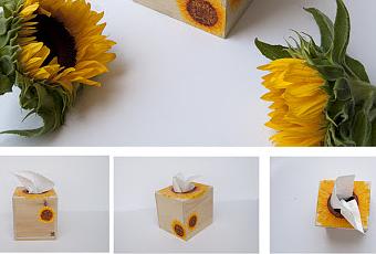 En aquesta caixa de mocadors el protagonista de la decoració és el gira-sol amb tons grocs i taronges, fent-lo molt present a la zona per on surten els mocadors. La composició crea un fabulós impacte visual. En esta caja de pañuelos el protagonista de la decoración es el girasol, con tonos amarillos y naranjas, haciéndolo muy presente en la zona de donde salen los pañuelos. La composición crea un fabuloso impacto visual.