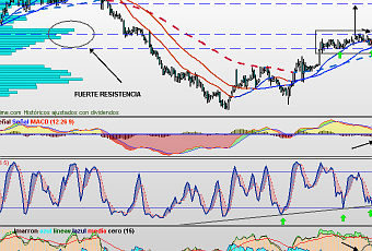Todas sus medias están alcistas, tanto las de más corto plazo, como las de largo plazo. En el Koncorde la mano fuerte está entrando compradora, pero todo no puede ser bonito, los niveles de volumen marcan que la zona a la que se enfrenta Caixabank, tiene mucha importancia.