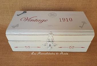 En la tapa la palabra Vintage y una fecha muy importante, el año en que nació mi madre, unos sellos y una llave de madera pintada de gris al igual que los sellos.