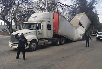 Soledad de Graciano Sánchez.- Esta tarde se vio afectado el tránsito sobre Periférico Oriente a la altura de la entrada a Fracción Rivera, luego de que la caja de un tráiler se doblara a la mitad por sobrepeso.