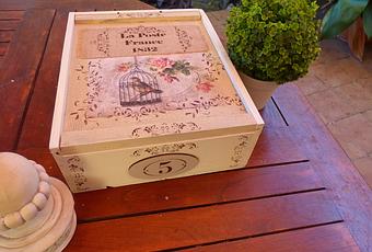 En esta ocasión he craquelado la tapa de la caja solamente. La caja vá pintada del tono encaje de las Chalky y solamente la tapa del tono Timeless, con color de base marrón oscuro.He utilizado papel de arroz...... me chifla cómo se trabaja. Los bordes del papel los he disimulado estarciendo una cenefa....esta, en concreto
