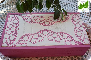 La tapadera de la caja píntala de color blanco. Da varias manos, deja secar entre capas y cuando esté completamente seca, pega la blonda con cinta de carrocero.