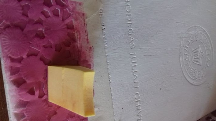 Para hacer nuestras manualidades de reciclaje podemos apañarnos con cosas que tenemos en casa, reduciendo así, el gasto del trabajo que vamos a realizar. Por eso, para decorar esta caja de vinos he utilizado un mantelito de papel, de los que usamos para presentar tartar y pasteles, los de blonda. Para estampar la pintura he usado una esponjita de maquillaje. Seguro que todas tenemos una y si no es así, también podríamos emplear la esponja del estropajo, como por ejemplo, los de salvauñas.
