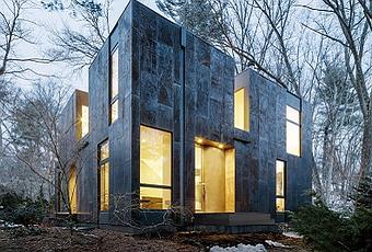 En el exterior, el contraste visual entre la geometría dura de la casa y el paisaje sinuoso se realza y se ofusca por el tono crudo de los paneles de acero de intemperie que componen el revestimiento de la casa. Las grandes áreas de vidrio que rodean los jardines y las ventanas de piso a techo reflejan los árboles y las plantaciones circundantes, difuminando aún más la distinción entre arquitectura y naturaleza.