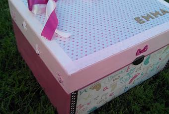 El exterior y el interior de la misma, va pintado con pintura de tiza, dos tonos de rosa y el separador con un gris. Dos capitas de barniz al finalizar y listo.