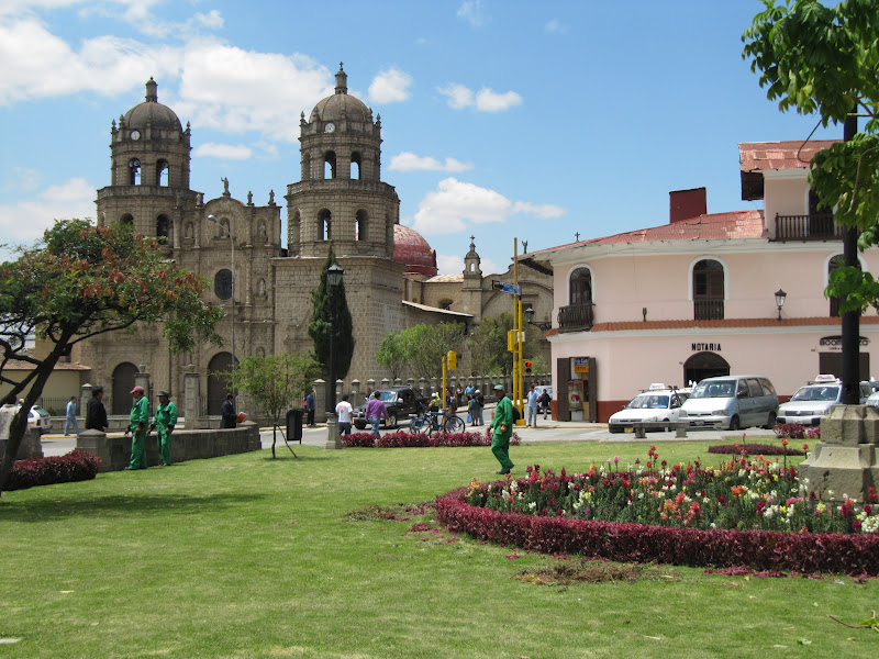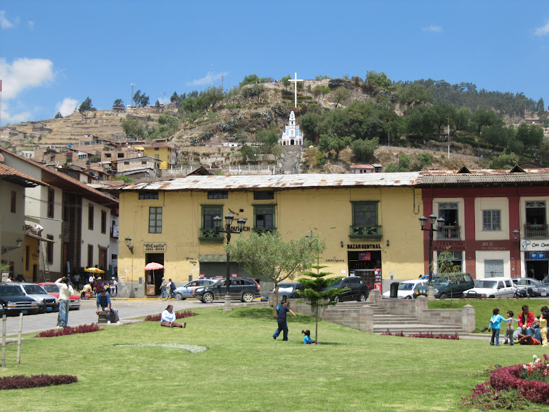 Pese a haber vuelto después de 15 años, y con ojos más receptivos, pude notar que la belleza y encanto de muchas cosas en Cajamarca seguían intactas. Lo que había cambiado, y mucho, era el ambiente o la atmosfera del lugar. Cuando vine aquí en el viaje de promoción no recuerdo haber visto gente en las plazas con pancartas y panfletos que arengaban a oponerse a la minería, el supuesto motor del avance económico de Cajamarca, ni haber visto tanta miseria y pobreza en uno de los lugares supuestamente más boyantes del norte peruano. Creo que en todo nuestro periplo por el nororiente peruano no vimos tanta mendicidad ni campesinos, que con ojos desesperados, se nos acercaran para pedirnos una moneda. Así que esta era la prospera Cajamarca, lugar que es resumen de la historia peruana y donde las fricciones y choques entre mundos muy distintos e intereses dispares se siguen dando como se dieron desde hace cientos de años en que se vieran cara a cara incas y españoles. Justamente el lugar en donde se dio ese encuentro es el lugar ideal para iniciar la visita de la ciudad: la Plaza de Armas que es como le llamamos en el Perú a las plazas centrales o mayores de todas las ciudades o capitales.