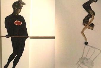 Un funambulista con la luna hecha pedazos y el corazón sangrante junto a un malabarista que hace equilibrio de cabeza sobre una vieja silla de Viena a la que se le partió una pata y parece desvanecerse en el espacio.