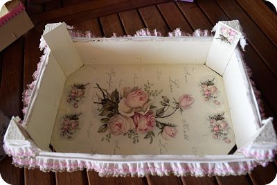 Primero prepara la caja, lija un poco las superficies que están ásperas. Da varias manos de pintura a la tiza, hasta que queden bien cubiertas. Dónde vaya el decoupage tiene que ser de color claro, pues traspasaría la servilleta.Con cinta de carrocero separa las superficies a pintar de distintos colores.