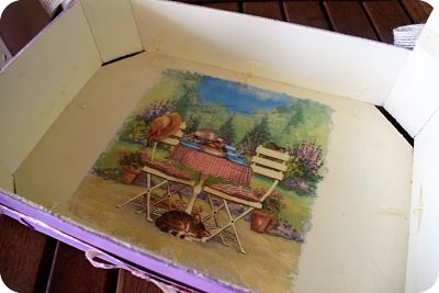 Una vez que está preparada la caja, separa las capas de la servilleta quedándote con la decorada. Con una brocha da cola de decoupage sobre la base de la caja. Pon la servilleta encima, siempre pega del centro hacia afuera para que no te queden arrugas, da una mano de cola encima de la servilleta con una brocha de pelo sueve. Espera a que se seque y da varias manos más. Proteje con el barniz.Da cera a la caja por donde no tenga decoupage para protejer la pintura.