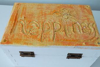 "La tocaste para ella, tócala para mi. Si ella pudo soportarlo, yo también podré. ¡Tócala Sam!¡Tócala!"Casablanca A Alegría... Cajita de madera pintada en color blanco y decorada con arcilla blanca, y pintada a pincel seco, en este caso con la palabra HAPPINESS, para alegrar nuestros dias grises Sed felices!!!