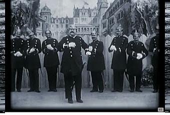 Empezamos con un antecedente, una película sonora alemana de 1908, 'Schutzmannlied aus Donnerwetter-Tadellos! (La canciòn de la policía)'. El sonido fue grabado originalmente en disco fonográfico, y la verdad es que tiene su gracia. No podemos incrustar el vídeo porque la estupenda web de Europa Film Treasures no lo permite, celosos que son ellos de "sus cosas". Así que adornamos el comentario con el fotograma de la izquierda y si pincháis en él vais a donde podéis verlo.