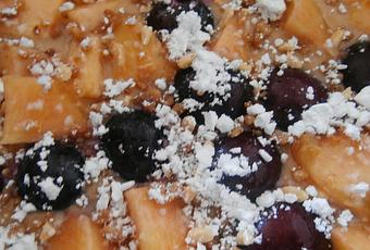 Distribuimos la fruta troceada al gusto y finalmente añadimos el crocante y lo espolvoreamos con azúcar glass.