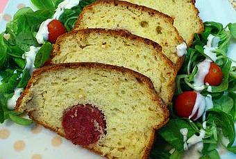 2.- Precalentamos el horno a 200ºC. En un bol, mezclamos el resto de ingredientes con unas varillas. En un molde de cake previamente engrasado, echamos un poco de la mezcla, que cubra el fondo, añadimos el salchichón y encima echamos lo que queda de mezcla.