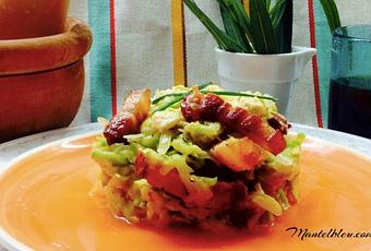 Colocamos nuevamente la sartén con la panceta, incorporamos el calabacín y echamos la salsa carbonara.
