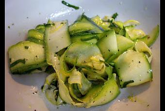 Cortamos los calabacin en lonjas, una manera fácil de hacerlo es con un pelador de papas, las colocamos en un envase de vidrio, agregamos los ajos machacados, la pimienta y el cilantro. Mezclamos bien todo, agregamos el vinagre, volvemos a mezclar y finalmente, incorporamos el aceite de oliva. Dejar macerar por 2 días preferiblemente. Servir bien frío.