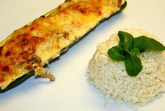 4. En una rustidera/bandeja para horno engrasada con mantequilla, ponemos las mitades de calabacin y los vamos rellenando uno a uno.