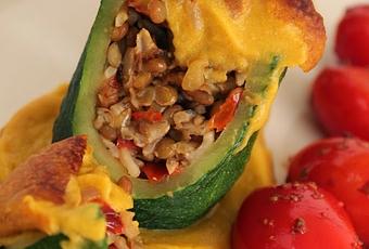 Calabacín relleno de lentejas y arroz basmati con crema de zanahoria.