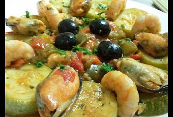 Ingredientes para 2 personas:3 calabacines medianos½ unidad de pimiento verde½ unidad de Pimiento Rojo3 dientes de ajo6 Unidades de Langostinos6 Unidades de mejillones6 Unidades de almejas6-8 Unidades de Aceitunas Negras¼ Manojo de Perejil1 Cucharilla de Pimentón dulceSal y aceite