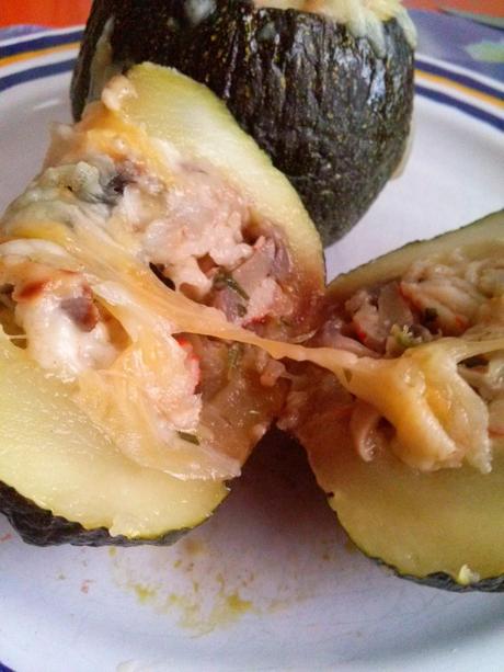 Pica las cebollas y los ajos. Pon aceite a calentar en una sartén y sofríe. Vacía los calabacines cortando con un cuchillo sólo la parte superior, para rellenarlos enteros. Reserva la pulpa que has sacado.Añade los champiñones laminados, la pulpa de los calabacines, sal y pimienta. Continúa con el sofrito hasta que todo esté tierno.Mientras pela las gambas ( con las cáscaras puedes hacer un fumet para cualquier otro guiso o receta. Recuerda: No tiramos nada ). Pica los palitos de cangrejo y añádelos junto con las gambas al sofrito anterior. Espolvorea por encima el perejil picado. Remueve todo a la vez y deja que terminen de hacerse las gambas durante unos 2 minutos.