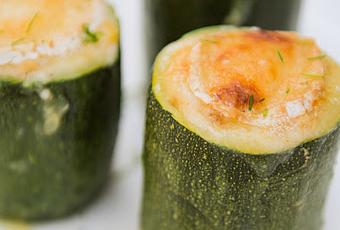 Precalentamos el horno a 200º.Ponemos encima de cada calabacín un trocito de queso y cocinamos cocinamos en horno a 180º durante 20 minutos o hasta que esté dorado el queso.