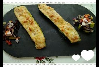 Picamos la cebolla, calentamos aceite y sofreímos cuando ya empieza a dorarse echamos el calabacín y el rape, tomate, dejamos sofreir.Echamos un poquitín de azúcar. Ponemos las gambas y cuando lleve unos minutitos el atún, apagamos el fuego. Ponemos los calabacines en una bandeja de horno. El relleno lo mezclamos con la bechamel, rellenamos los calabacines. Ponemos queso rallado y gratinamos.