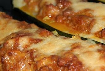 Cortar los calabacines por la mitad y rallarlos con ayuda de un cuchillo.Los colocamos en una bandeja y ponemos un chorrito de aceite y sal por encima. Introducir en el horno hasta que estén blandos, suficiente para poder sacar la carne del calabacin. Sacamos y mezclamos con la salsa boloñesa. Colocamos el queso encima e introducimos en el horno unos minutos y a continuación en la función de grill para que el queso coja un poco de color.