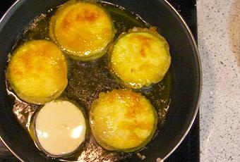 los calabacines rellenos de jamón york y queso, rebozados y fritos con témpura.