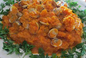 - Calabaza de freír 500 g.- Almejas 250 g.- Ajos 3 dientes.- Pimentón 1 cda.- Vino blanco 1 vaso.- Aceite de oliva 4 cdas.- Guindilla (al gusto).- Sal.