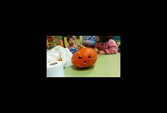 Hoy hemos vaciado una calabaza, y le hemos hecho boca, nariz y ojos para transformarla en una calabaza terrorífica…