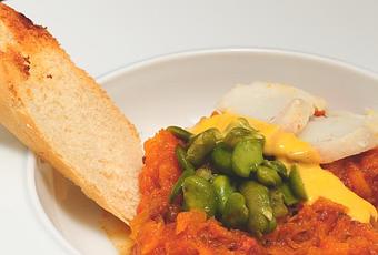 Poner una capa abundante de calabaza, unas lascas de bacalao confitado, unas habitas tiernas peladas y confitadas en aceite de oliva y un chorrito de pil-pil, servir acompañado de una rodaja de pan recién tostado.