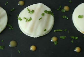 Con ayuda de un vaso o un corta pastas circular cortamos unos círculos de gelatina de queso. Siempre un número par.