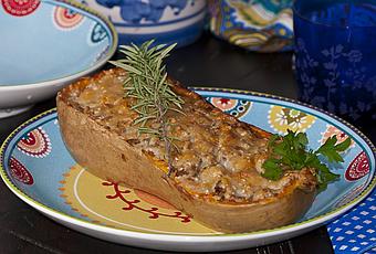 - Poner el grill del horno a la máxima potencia. Meter la calabaza y cuando el queso se comience a dorar, sacar y servir caliente.
