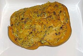 Rellena con esta mezcla la piel de la calabaza que habías reservado e introduce la calabaza en la parte media del horno .