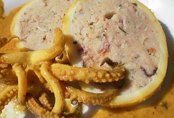En un cuenco echar la carne picada de calamar, pescado y de los langostinos, la cebolla, los ajos y el perejil muy picaditos, el pan remojado en leche, el huevo, los mejillones cocidos cortados en trozos pequeñitos, salando al gusto y mezclar bien. Si no queda muy compacta añadir pan rallado.
