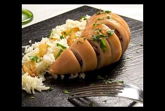 Con ayuda de una cucharilla rellenar los tubos de calamar reservados, distribuyendo el relleno uniformemente por todo el interior. Cerrar con un palillo.