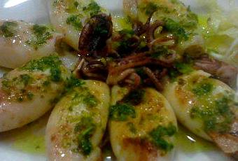 INGREDIENTES: -calamares medianos, -1 ó 2 diente de ajo -perejil -un limón -aceite de oliva virgen extra-sal PREPARACIÓN Se limpian y lavamos bien los calamares, los ponemos en un plato y le ponemos una pizca de sal. En un cuenco pequeño ponemos el ajo muy bien picado, perejil y un chorro de aceite de oliva vigen extra y mezclamos bien . Podemos hacer en una sartén o en una plancha eléctrica, cada cual que elija. Ponemos un hilo de aceite y cuando esté caliente ponemos los calamares. A los tres minutos más o menos les damos la vuelta. Cuando empiecen a dorarse añadimos el aliño de ajo y perejil y movemos todo bien. Ahora es el momento de añadirle el zumo de medio limón. Acompañamos el plato con una ensalada de col (repollo) y mayonesa.
