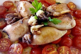 5 calamares frescos pequeños, 1 limón, 20 tomates cherry, orégano, albahaca, perejil, 1 diente de ajo, vino blanco, sal y aceite.